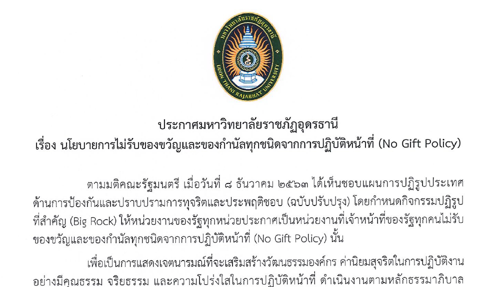มหาวิทยาลัยราชภัฏอุดรธานี ประกาศ No Gift Policy พ.ศ.2568