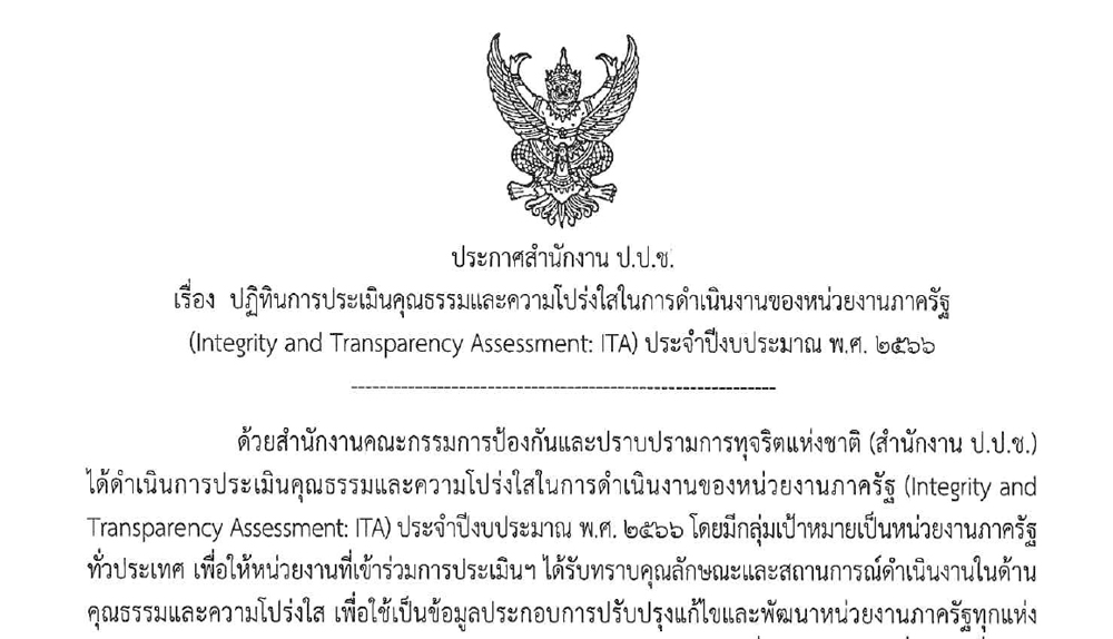 ด้วยคณะกรรมการ ป.ป.ช. ในการประชุมครั้งที่ 133/2565 เมื่อวันที่ 23 พฤศจิกายน 2565 ได้มีมติเห็นชอบกรอบระยะเวลาการประเมินคุณธรรมและความโปร่งใสในการดำเนินงานของหน่วยงานภาครัฐ (Integrity and Transparency Assessment: ITA) ประจำปีงบประมาณ พ.ศ. 2566 เป็นที่เรียบร้อยแล้ว
