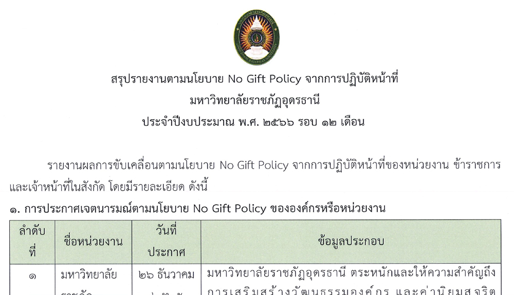 มหาวิทยาลัยราชภัฏอุดรธานี ประกาศ No Gift Policy พ.ศ.2567
